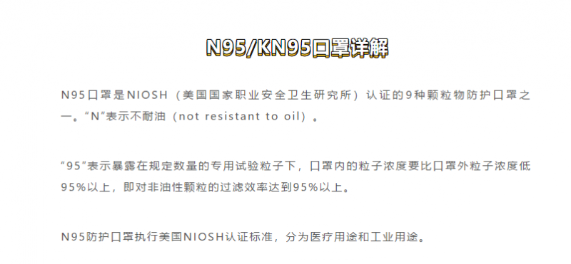 国内生产的KN95口罩执行的标准是GB 2626-2006《呼吸防护用品―自吸过滤式防颗粒物呼吸器》,它是安监劳保领域用于防护各类颗粒物吸入的工作场合使用的口罩,与N95的测试方法和技术要求类似,因此能起到较好的阻隔防护作用。